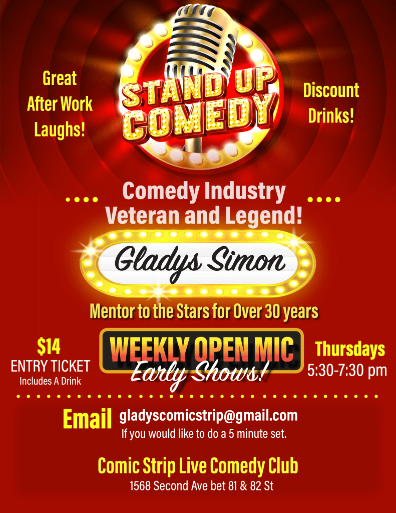 I’m performing at the Gladys Early Show this Thursday May 2nd at 5:30. Comic Strip on Second Avenue and 82nd Street.